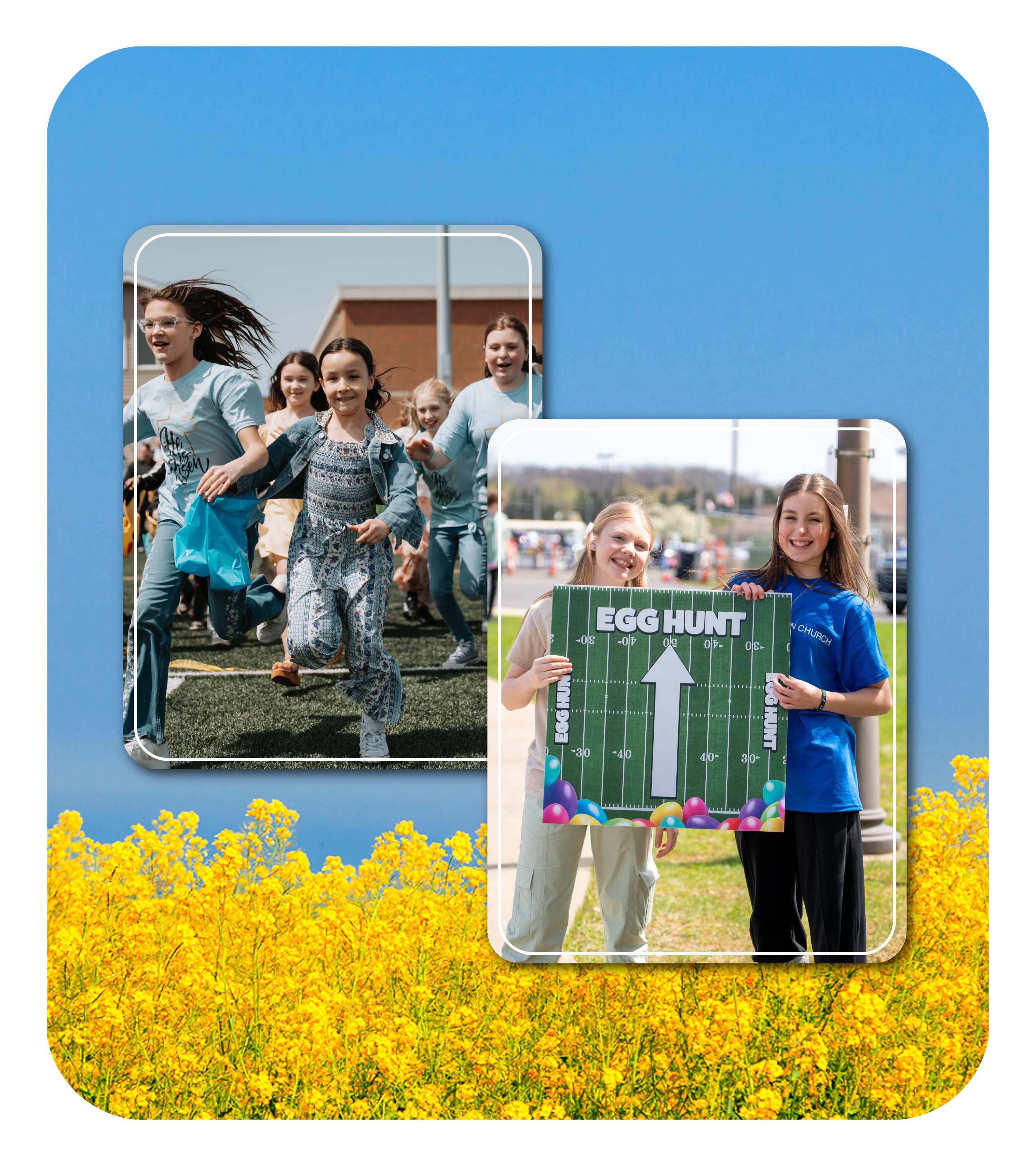 Get ready to hop into Easter fun! 🐰 After each service, your kids will have a blast as they dash across the football field to discover thousands of candy-filled eggs! Designed for preschoolers through 5th graders, it’s a fun, festive way for kids to celebrate Easter with friends and family.